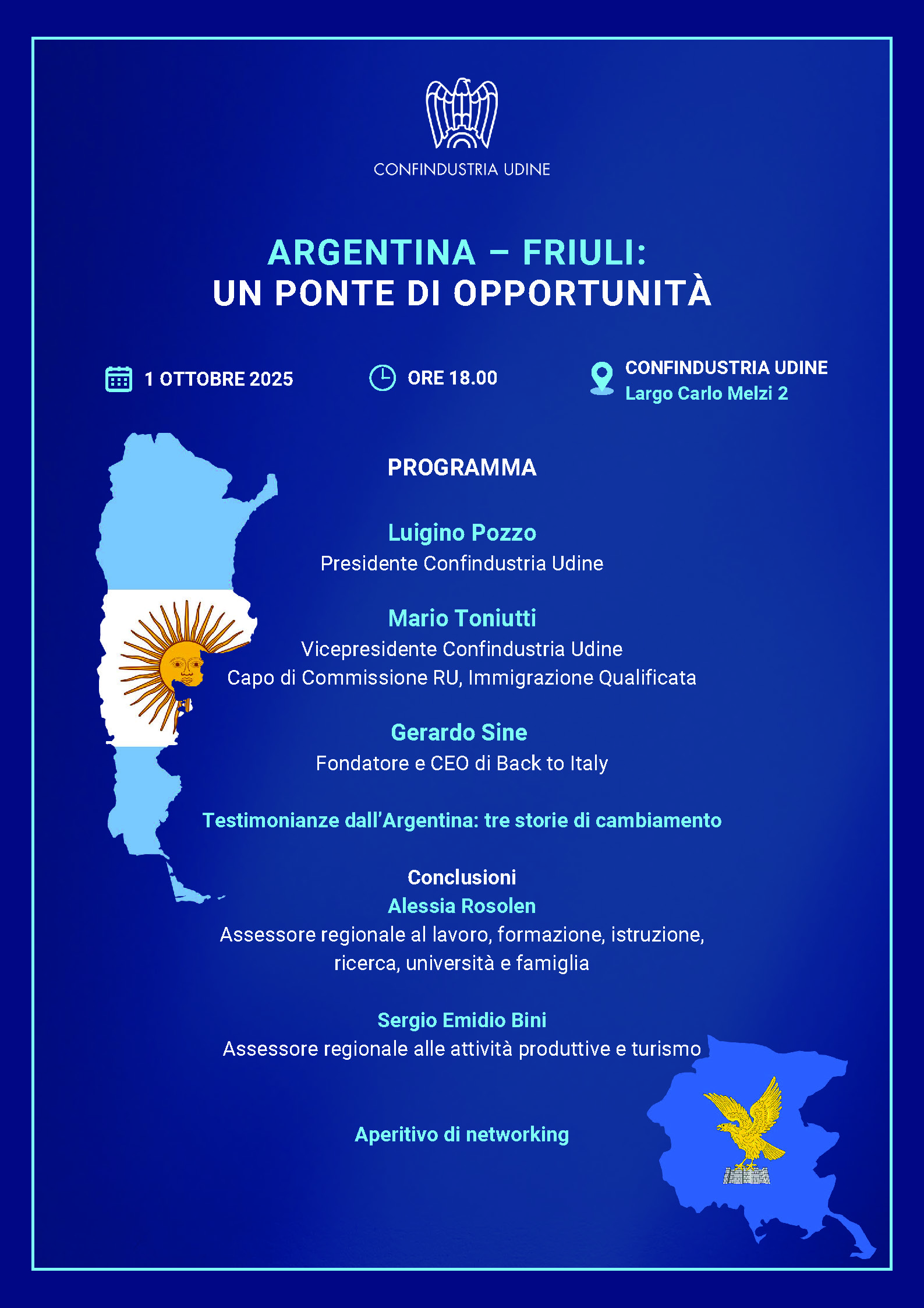 L'evento “Argentina – Friuli: un ponte di opportunità”, si terrà il 1° ottobre p.v. alle ore 18.00 presso la sede di Confindustria Udine (Largo Carlo Melzi, 2).